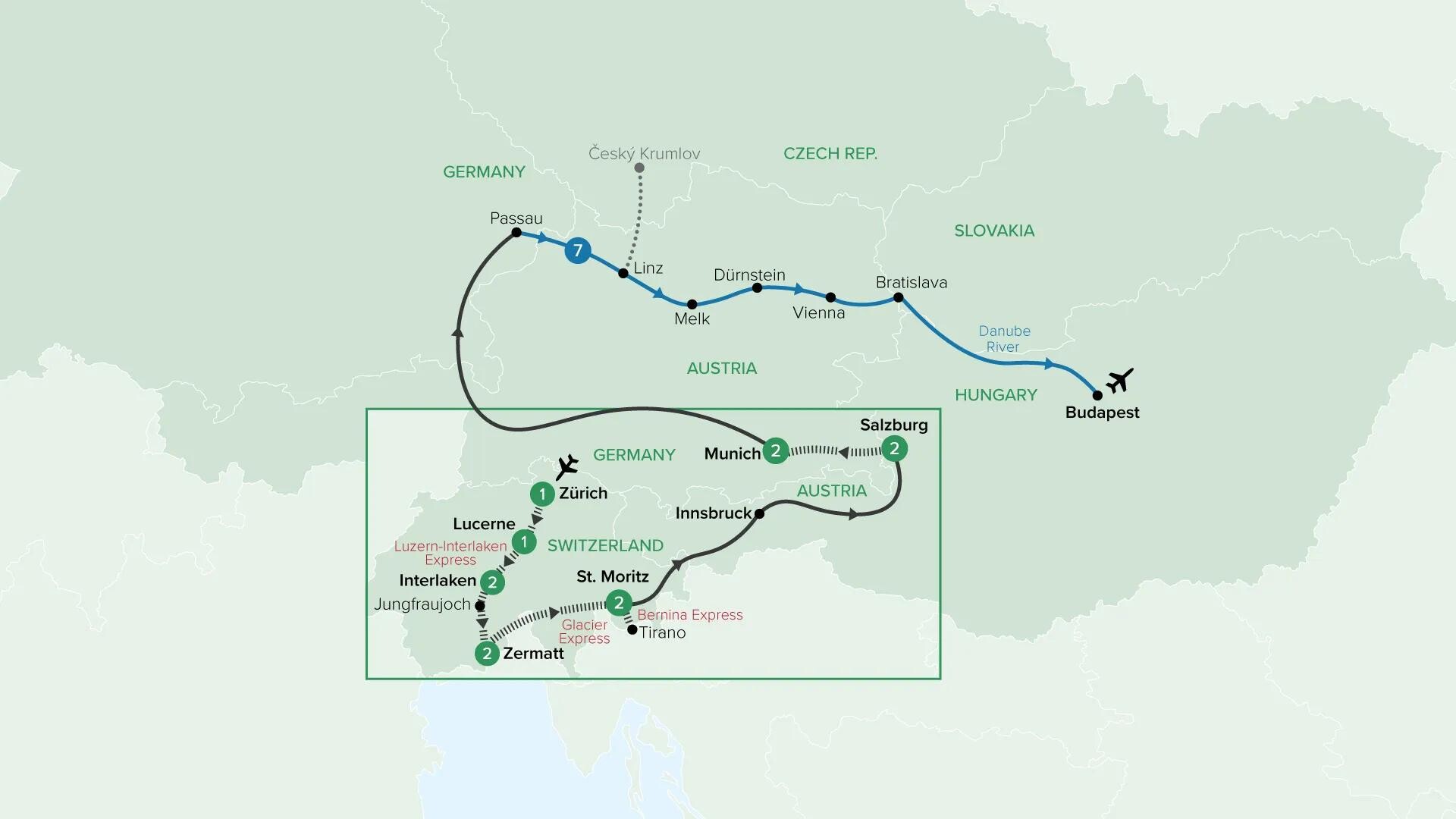 Discover Europe by rail and river on a journey combining Switzerland’s alpine icons with a Danube River cruise. Begin in Zürich and Lucerne, ride the famed Glacier Express and Bernina Express, visit Jungfraujoch and Zermatt beneath the Matterhorn, then continue through Salzburg and Munich, including fairytale Neuschwanstein Castle. Finally, cruise the Danube through Austria, Slovakia and Hungary, exploring the Wachau Valley, Vienna, Bratislava and Budapest.
