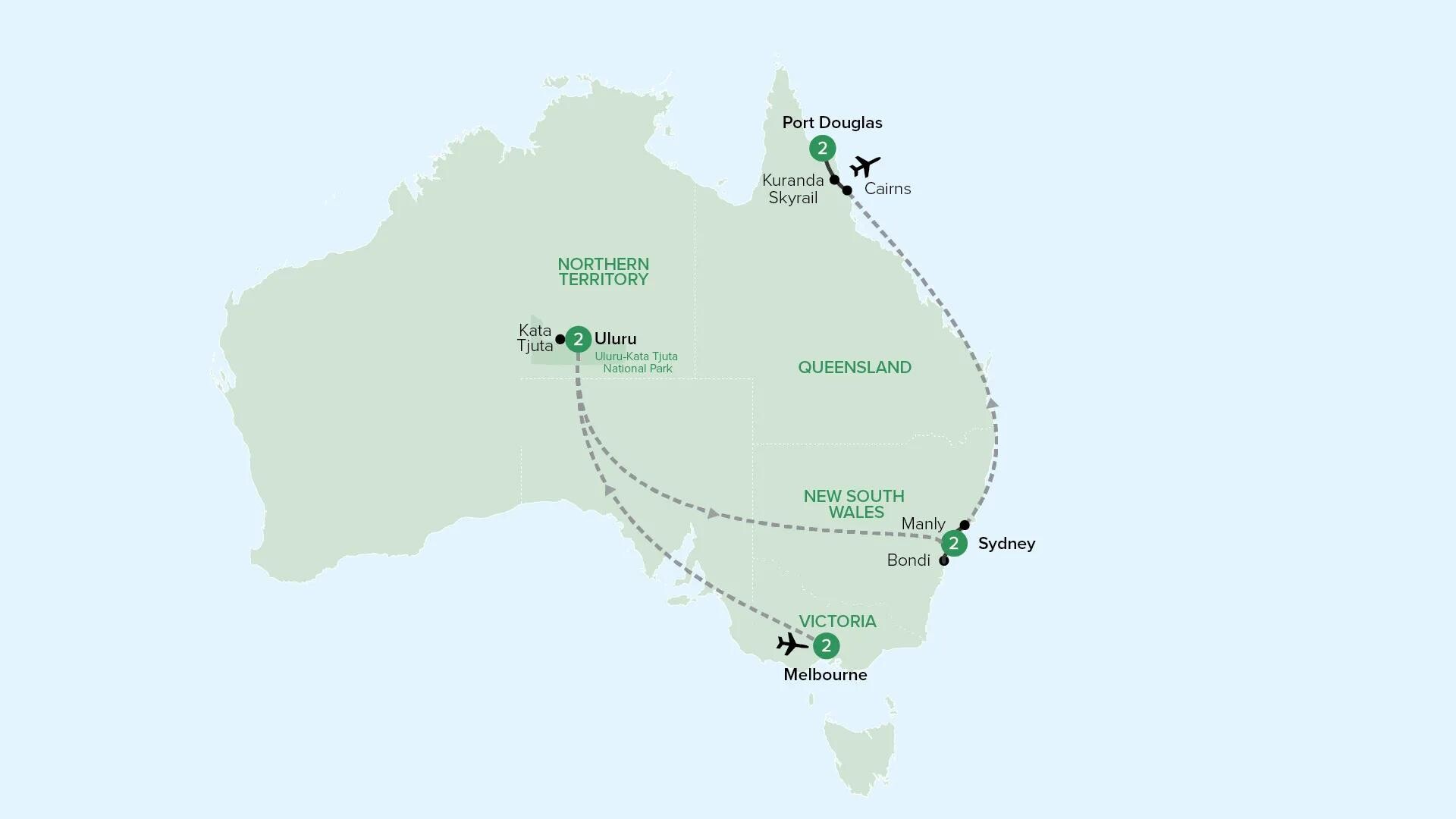 Explore the best of Melbourne, Uluru, Sydney and Cairns on this spectacular journey through Australia’s highlights. Discover the heart of Melbourne’s culture, witness the beauty of Uluru-Kata Tjuta National Park, and delve into the wilderness of Far North Queensland.Itinerary