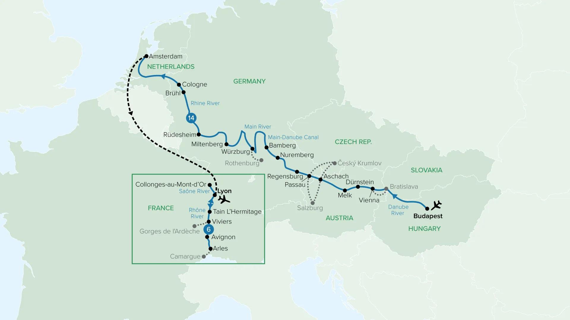 Board your state-of-the-art Travelmarvel river ship from Budapest to Amsterdam before embarking on a Rhône River Cruise in France on the MS Van Gogh.