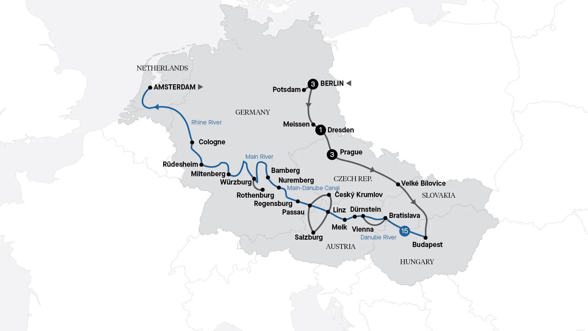 Explore Christmas markets in Berlin and savour an unforgettable day out at Chateau Jemnište just outside of Prague. Then, embark on a festive river cruise from Budapest to Amsterdam. Celebrate Christmas Day in the picturesque city of Regensburg and bring in the new year in Cologne.
