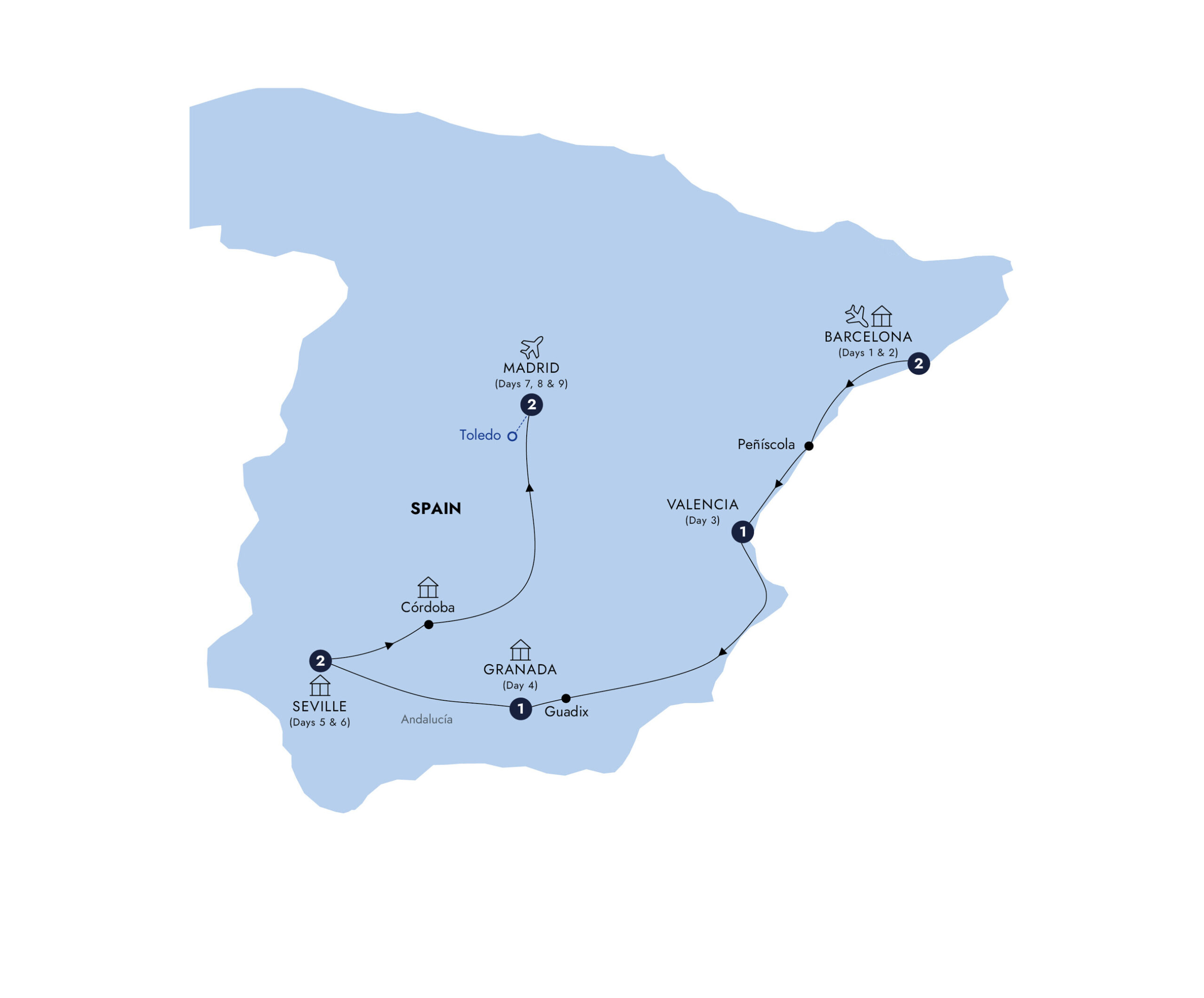 See the beautiful world of Spain during this 9-day guided tour. Begin in Barcelona, where a Local Expert will lead you along the city’s narrow lanes to the Sagrada Família, a basilica built by the architect Antoni Gaudí. Paella was created in Valencia. Later, enjoy a private cooking demonstration at a family-run restaurant while sampling the local flavours. See glorious views of the Sierra Nevada before reaching Granada, where a Local Expert will guide you through one of the most remarkable fortresses ever built: the Alhambra. In Seville, learn the art of flamenco dancing during a private lesson, then be treated to a passionate performance by professionals. Visit the Prado Museum in Madrid with an art historian, who can share the stories behind Spanish masterpieces by artists such as Francisco Goya.Itinerary