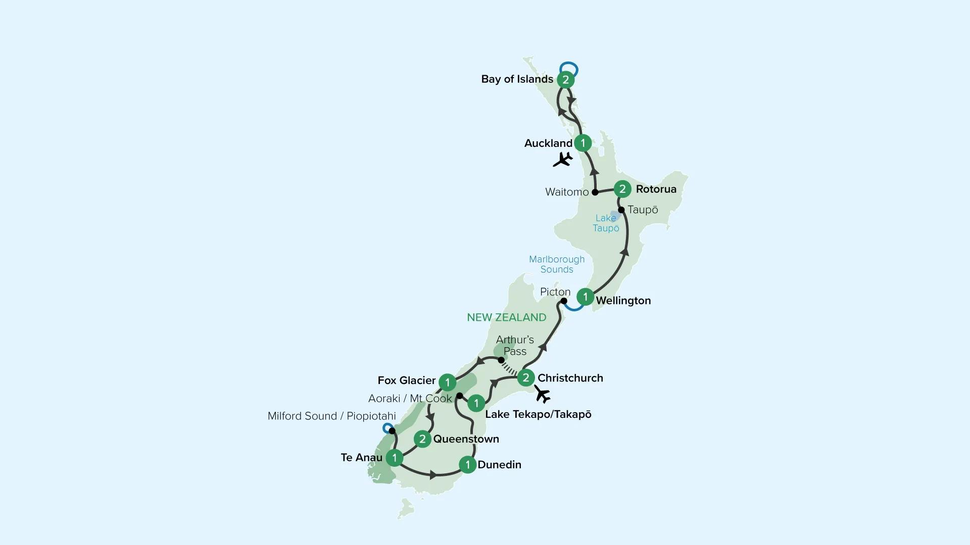 Experience the best of New Zealand, from the South Island’s epic scenery to the North Island’s geothermal landscapes. Visit Aoraki/Mount Cook, Dunedin, Milford Sound/Piopiotahi and Queenstown. Travel on the scenic TranzAlpine train and take the Interislander ferry to Wellington. Explore Rotorua and the Bay of Islands before concluding your tour in Auckland.