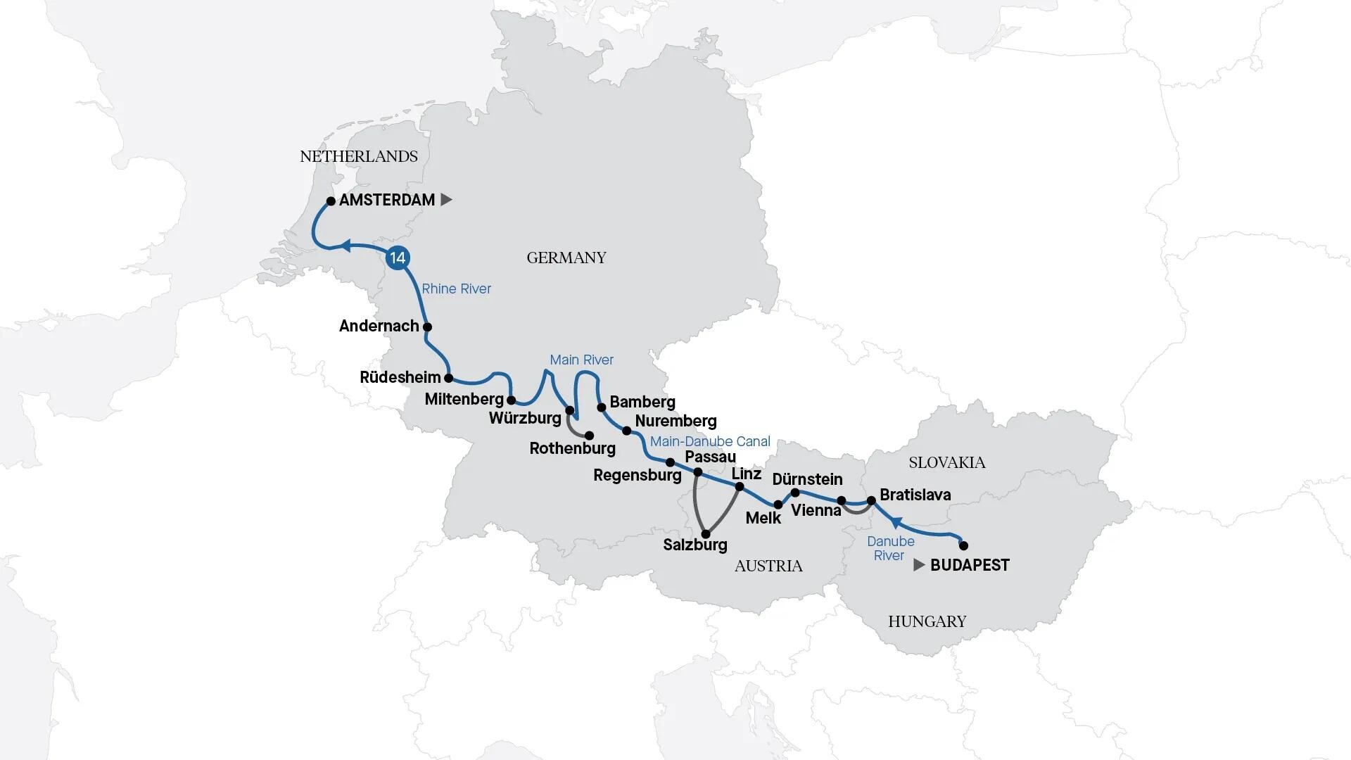 Experience Christmas in Europe as you travel in unrivalled luxury on our most popular river cruise. Commence in Budapest, Hungary's grand capital overlooking the Danube River. Enter Austria, and explore Vienna, including an exclusive cocktail party and private recital at the City Palace, before heading along the Main, stopping at delightful medieval German towns on the way. Here, you'll be immersed in the festive atmosphere of some of Europe's most enchanting Christmas markets. Your cruise culminates in Amsterdam. A 16-day Magnificent Europe with Christmas and New Year's Eve cruise is available in 2026 (refer to EUMCX16).